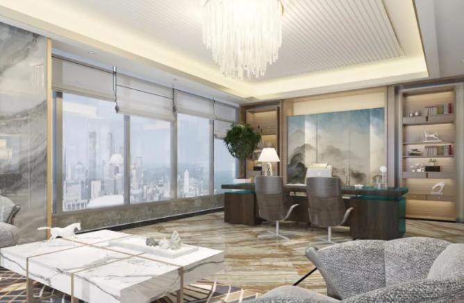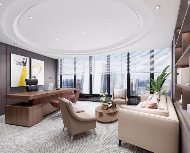 2、現(xiàn)代輕奢風辦公樓接待大廳裝修:整個辦公空間分為頂、墻、地三個部分,頂面以圓形和橢圓形疊級吊頂造型裝飾,輕松、休閑的燈光營造氛圍,在接待客人談生意時,裝修也能體現(xiàn)一家老板的品味與性格,還有該公司的實力,公共區(qū)域墻面采用高檔木飾面板裝飾,地面則是地毯滿鋪??偨?jīng)理辦公室裝修設(shè)計中重要的是超大的落地窗,總經(jīng)理工作上的壓力往往是常人難以感同身受的,站在三十多樓的高樓里,可以一覽城市風光,居高臨下俯視這座城市,眺望遠方舒緩內(nèi)心的壓抑。