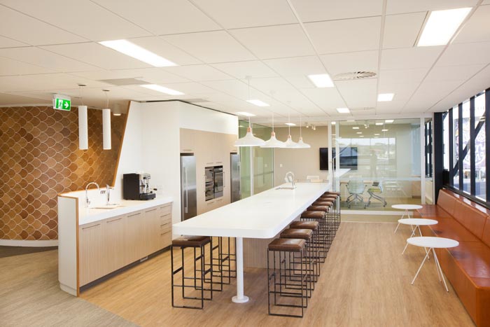 辦公室茶水間的設計:在上海辦公室茶水間的設計上,設計師一直追求的就是空間之間的相互結合,故此茶水間的位置十分重要,設計師將其安置在空間的一側靠近墻壁的區(qū)域,以此釋放更多的空間做為休息區(qū)之用,此處的休息區(qū)呈長方形分布,讓員工可以在這里休息、交流、玩耍。