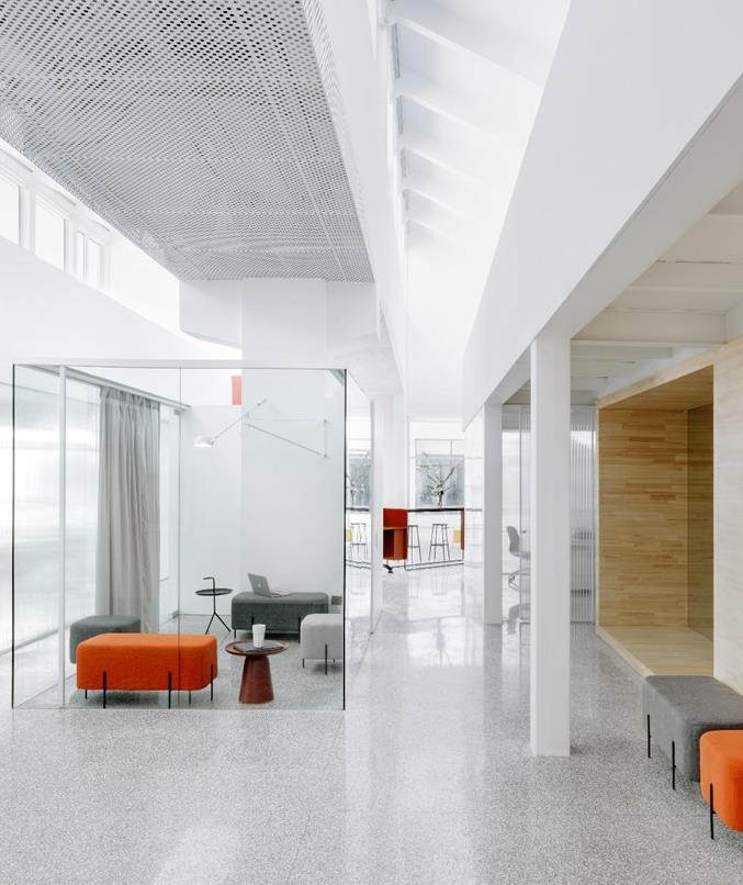 某創(chuàng)意園區(qū)辦公室裝修茶水間設計:將茶水間放置在兩翼的樞軸上意圖在于是其成為辦公室的社交中心,同時可以通過全玻璃立面欣賞到花園景觀。茶水間的前面有一個服務區(qū),儲藏食品的同時設置了服務器室、門衛(wèi)室、浴室、淋浴間和洗滌區(qū)。辦公室的設計爭取較大化每個部門的利益: 例如會計和管理或許會需要一個非常私人的辦公室,又或?;雍蜏贤ǖ牟块T需要一個開放的空間配置。紅色密度板圍合出來的盒子隱藏著兩個CEO的辦公室,他們可以享受大棚子的自然光和全高窗戶的花園景觀。