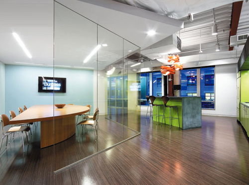 會(huì)議椅與定制的會(huì)議桌,會(huì)議桌面層為烤漆玻璃并嵌入條形白色橡木。