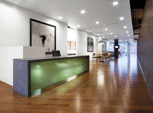接待區(qū)地面滿鋪染色榆木地板。前臺(tái)由皂石與樹脂制作。接待區(qū)60英尺長(zhǎng)的背景墻滿鋪板巖。