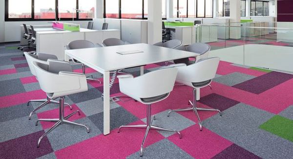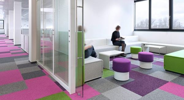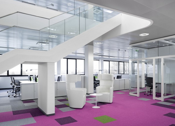 室內(nèi)中庭一條寬敞的洋紅色樓梯將上下貫穿在一起,開敞的空間促進員工間的交流與合作。洋紅、魅紫和新鮮的草綠地毯,將中庭空間裝扮的猶如美麗的調(diào)色盤,優(yōu)雅清新靚麗。