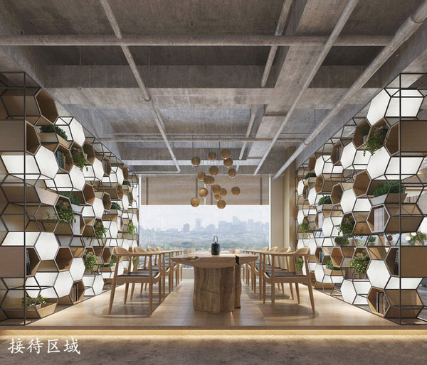 接待區(qū)域的設(shè)計:設(shè)計師在設(shè)計的時候,將其設(shè)置在一個湖光山色的自然空間,設(shè)計師希望通過這樣的設(shè)計拉近企業(yè)與顧客之間的關(guān)系,同時讓客戶對企業(yè)產(chǎn)生一種莫名的信任感,在交流的過程中不斷的了解對方,為下一步的合作留下契機(jī)。