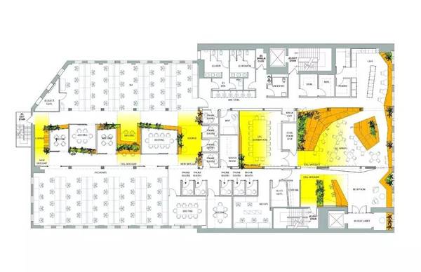 Sn?hetta對(duì)Slack新紐約空間設(shè)計(jì)的靈感來(lái)源于**特色的城市小院。從Paley Park的室內(nèi)景觀中吸取靈感,竹植物提供自然的隱私屏幕,并為綠化帶來(lái)空間。現(xiàn)有四個(gè)天窗與放大,八字天花板大大增加了室內(nèi)以及內(nèi)部小庭院的自然光線。