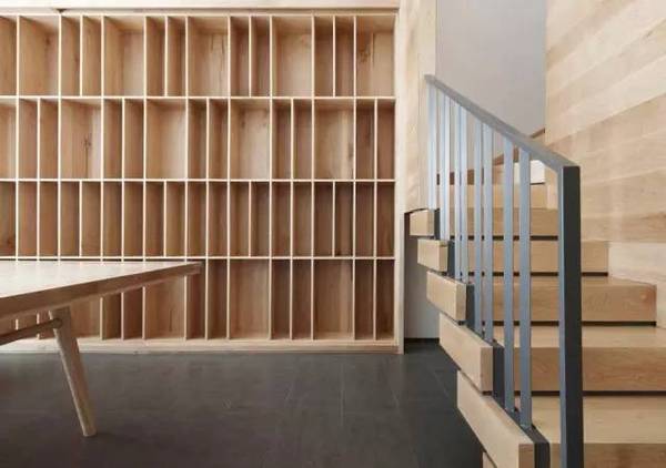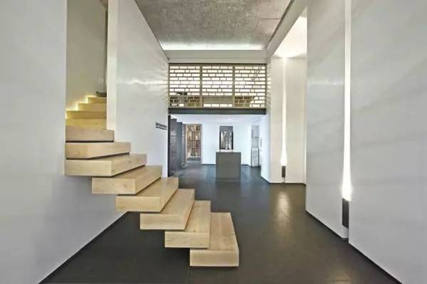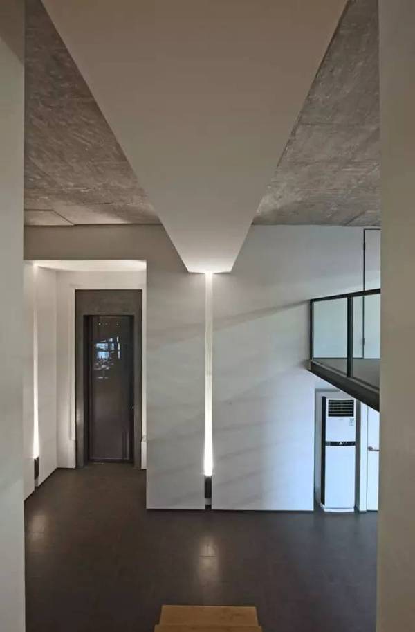 挑高的入口門廳中,地面運用了灰色仿古磚,原本白色的天花板表皮被鏟掉,露出原有的混凝土表情,打砂的方式使天花板既達(dá)到防塵的效果,又擁有特殊的細(xì)膩肌理。門廳中央為兩道白墻,白墻中間的細(xì)縫夾著一道窄窄的無扶手樓梯。這個看似冒險的設(shè)計實際上解決了屋頂建筑橫梁帶來的對閣樓人員流通的阻礙問題。