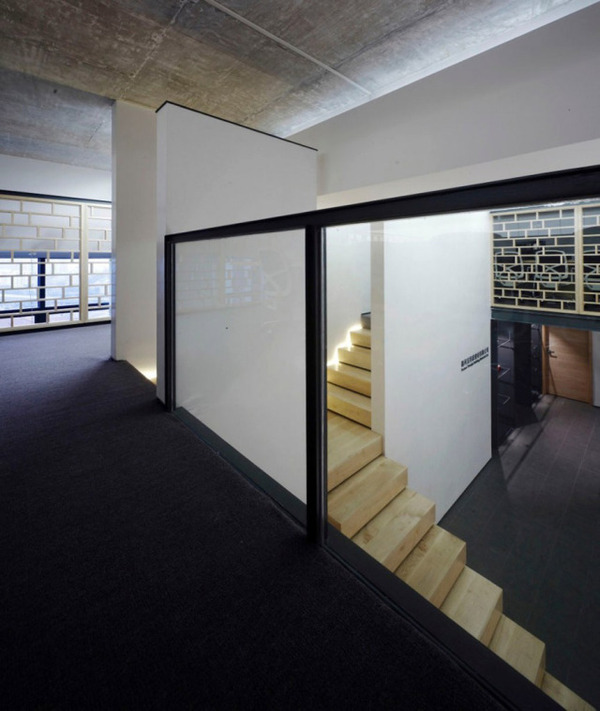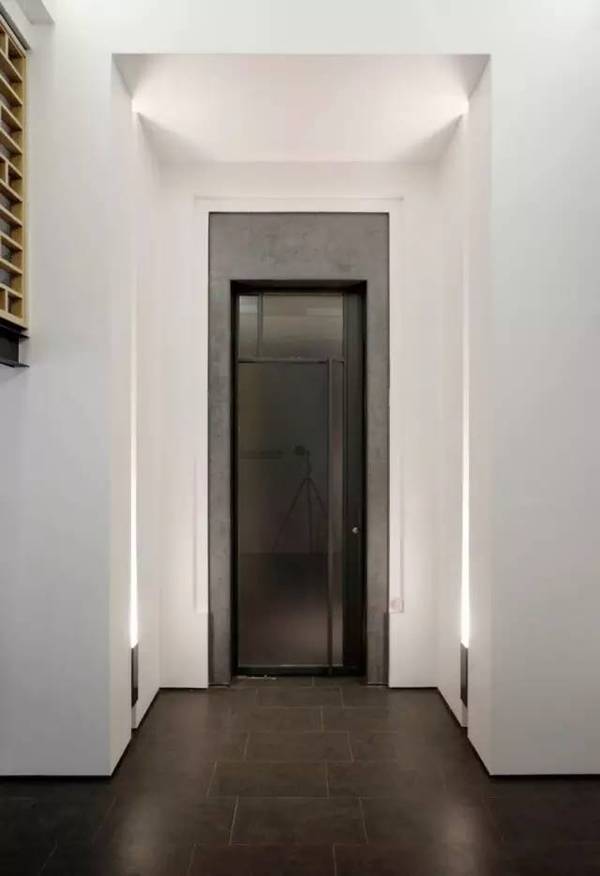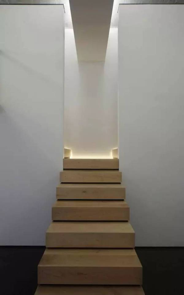 樓梯在中間往兩側(cè)分開,在高高的白墻中間,如同一道通往別處的裝置,吸引觀者登梯探訪。通過白墻和天花間露出的微光,可以看到白墻并未真正與墻接合,且邊緣用鋼條鑲嵌,展露出更鮮明挺拔的體塊形狀。為了提升空間的立體感,門廳沒有設(shè)置照明設(shè)備,唯有從遠(yuǎn)處墻壁的燈柱迎來的淡淡白光,令觀者一進(jìn)門即在這份寧靜中得到放松。