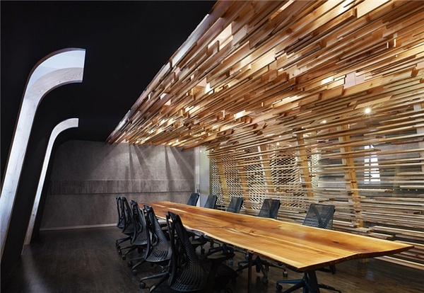 會(huì)議室的照明也經(jīng)過深思熟慮,燈具隱于頂面條板的上方,形成豐富的光影效果。由完整的櫻桃樹打磨而成的會(huì)議桌,呈現(xiàn)著木紋自然的曲線、訴說著不菲的價(jià)值。獨(dú)立辦公室沿外墻而設(shè),家具都采用橡木特別定制。