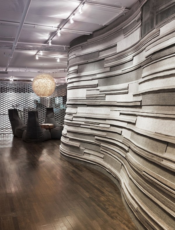 設(shè)計(jì)圍繞四個(gè)空間主題:休閑吧、線形開放式辦公位、羊毛氈飾面的空間結(jié)構(gòu)體、以及大會(huì)議室。場所不僅適用于辦公需求,還兼有多重功能,如舉辦各種派對(duì)、發(fā)布會(huì)、開幕式、以及招待會(huì)等,因此休閑吧成為空間的重中之重。