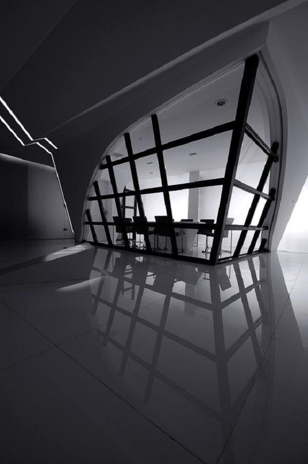 看到這個會議室,你會聯(lián)想到什么?領(lǐng)企小編我首先想到的是船頭。船頭是劈開大海波浪,帶領(lǐng)船身乘風破浪向前進的地方。把會議室裝修成船頭恐怕也是這個用意吧。辦公室設(shè)計大量運用灰色的原因恐怕就是灰色是無彩色,即沒有色相和純度,只有明度,使用灰色能夠為了突出這里的結(jié)構(gòu)設(shè)計了吧。