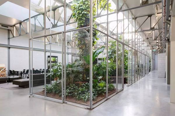 由荷蘭Space Encounters工作室為設(shè)計(jì)和制造人體工程學(xué)童車的Joolz公司,剛剛完成了位于阿姆斯特丹北部的一個(gè)1600㎡的辦公樓改造。這座玻璃屋原來(lái)作為舊倉(cāng)庫(kù),設(shè)計(jì)者首先去除底層室內(nèi)的所有墻體,利用高聳的種滿植物的玻璃屋將整個(gè)空間分成兩個(gè)長(zhǎng)廊似的辦公室,玻璃屋一直連到屋頂,與天窗結(jié)合在一起。