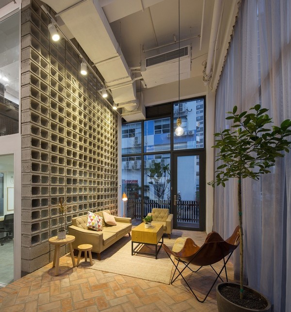 由一十一建筑改造設(shè)計(jì)的位于深圳的一棟聯(lián)合辦公空間,建筑由一棟工業(yè)建筑的首層一部分改造而來(lái)。由于室內(nèi)具有很高的天花,在確保自然光線能達(dá)到場(chǎng)地較深區(qū)域的前提下,設(shè)計(jì)者在局部區(qū)域設(shè)計(jì)了夾層。利用天花的高度,創(chuàng)造出更多的變化形式。同時(shí),利用一系列戶外建筑材料使用在室內(nèi)空間,作為重要公共區(qū)域的特色景觀墻,紅磚在室內(nèi)于室外的連續(xù)鋪設(shè),以模糊室內(nèi)外邊界和處理高差。