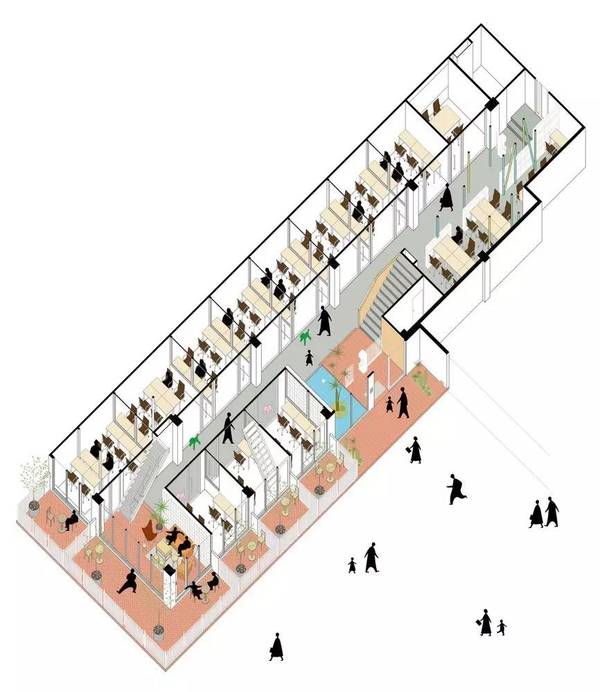 這樣的設(shè)計(jì)手法,給予室內(nèi)空間相互關(guān)聯(lián)。同時(shí),設(shè)計(jì)者還對(duì)建筑入口進(jìn)行了從視覺(jué)化的處理,移除面向西南角的三角形的區(qū)域,改為透明的立面,將被涂鴉的磚墻重新組裝,以制造出不同的涂鴉樣式,以此表現(xiàn)建筑以及社區(qū)間層層疊加以及穿插的歷史。