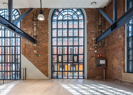 Jump Studios 需要改造的是位于馬德里的一所 19 世紀(jì)的電池工廠,有五層樓高,一些地方還保留了老式的紅磚墻。他們在對整個樓進(jìn)行完全檢查后對區(qū)域做出了重新的布局,在北邊開辟了一個新的入口,用了有現(xiàn)代感的黑色金屬且貫通兩層。