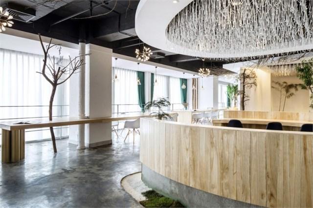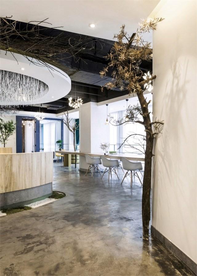 在材料的運(yùn)用上選用的都是一些環(huán)保低碳的天然材料,如樹(shù)枝、石竹、枯木、天然原木板,地面則是采用了水泥自流平的方式。