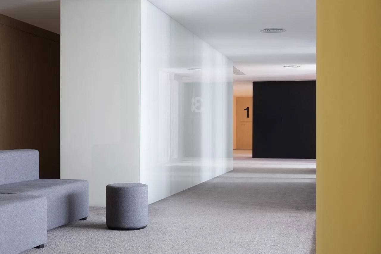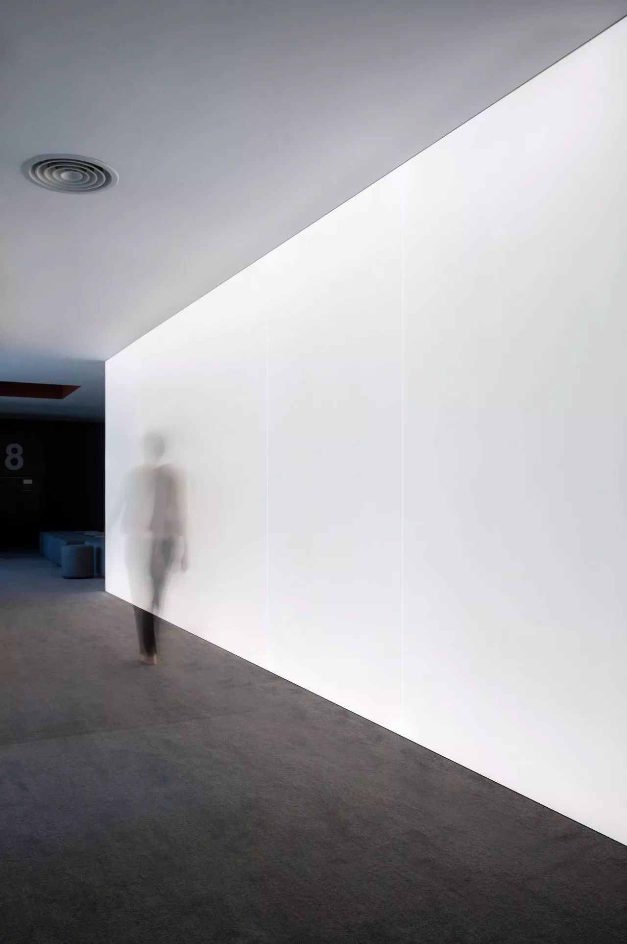 會(huì)務(wù)中心層的發(fā)光玻璃墻,滿足了整個(gè)空間的照明,同時(shí)又成為空間的視覺核心,營造出純粹、安靜、脫俗的藝術(shù)辦公空間氛圍。