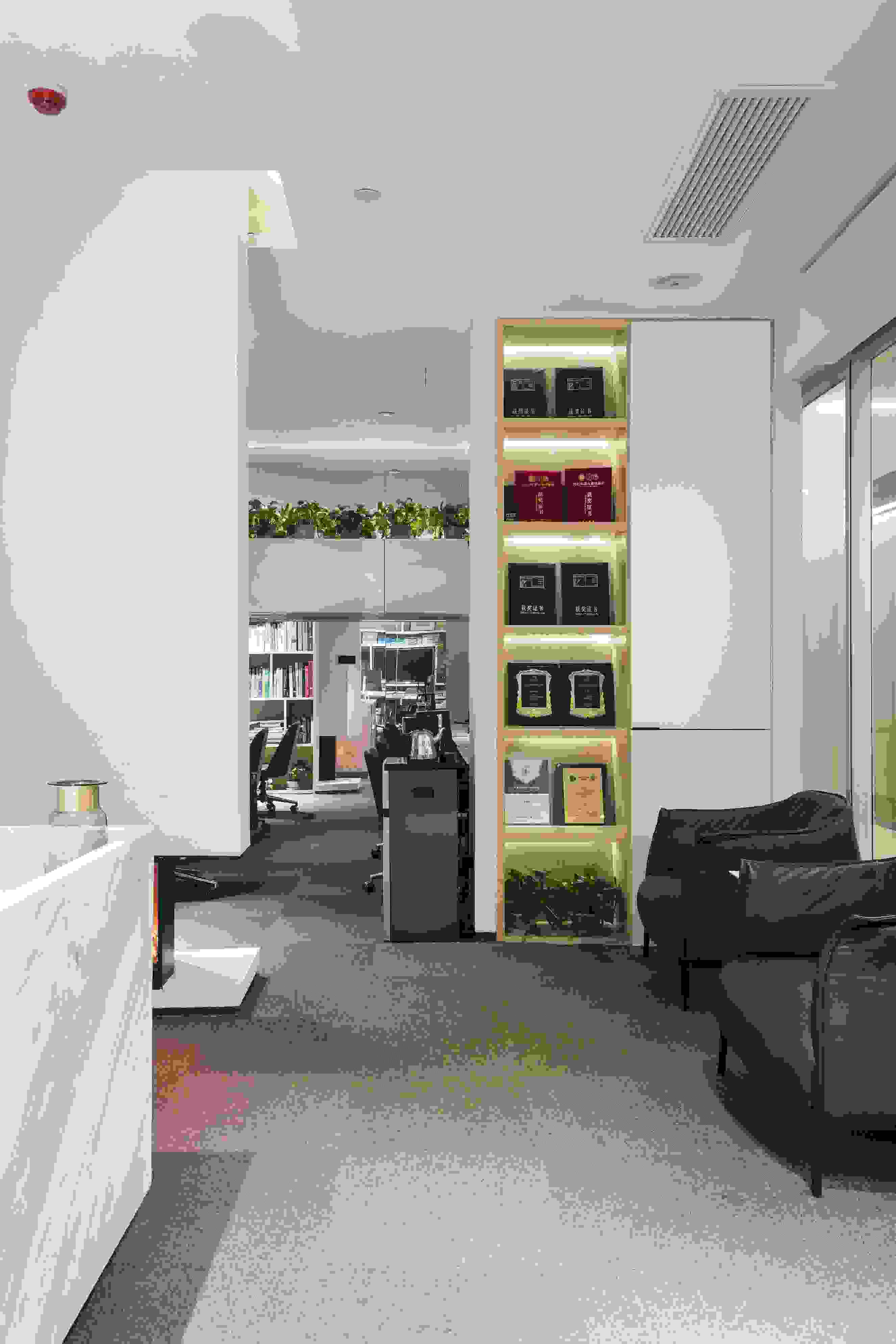 室內(nèi)過(guò)度空間(如閱讀區(qū))提供了人與人之外的交流,室內(nèi)空間采用單純的材質(zhì)和線條,配以鏡面和綠植,營(yíng)造清晰、舒適的辦公環(huán)境。