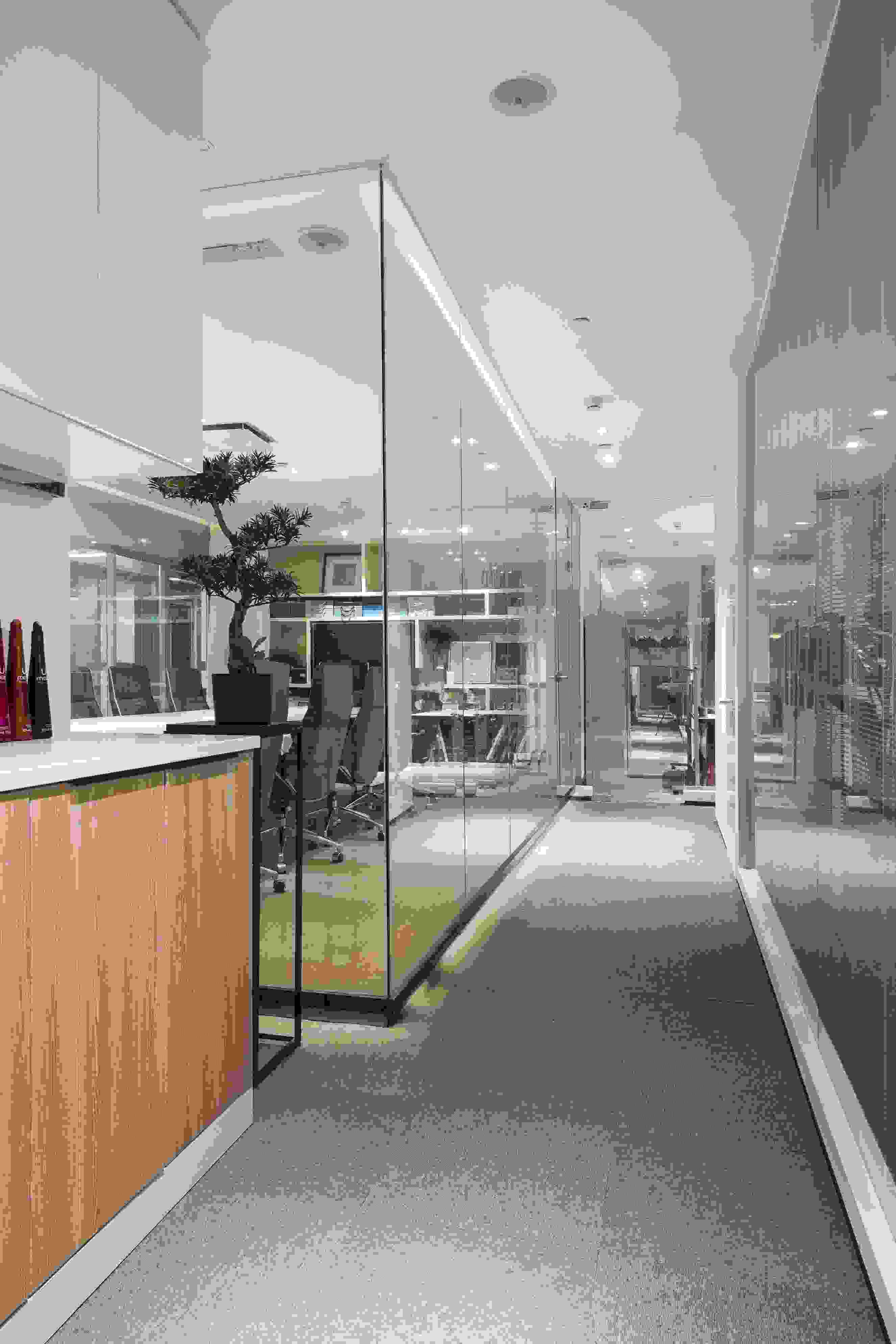 會(huì)議室以玻璃盒子為設(shè)計(jì)想法,運(yùn)用二次空間的形式,清楚地展示了空間里人與人之間的互動(dòng)。