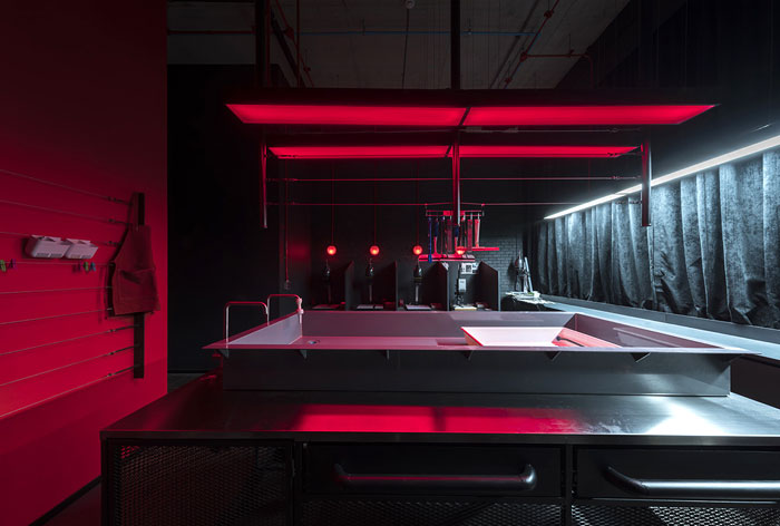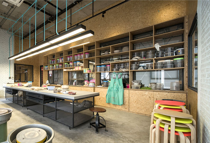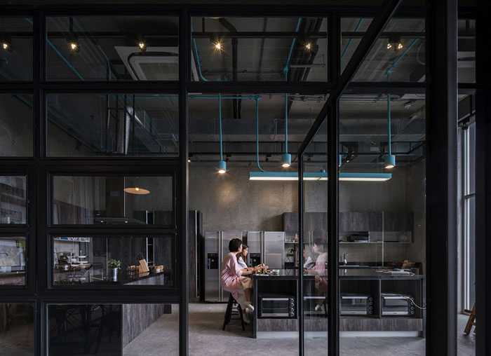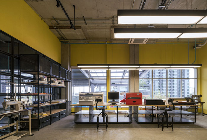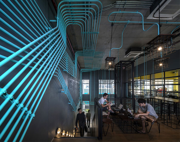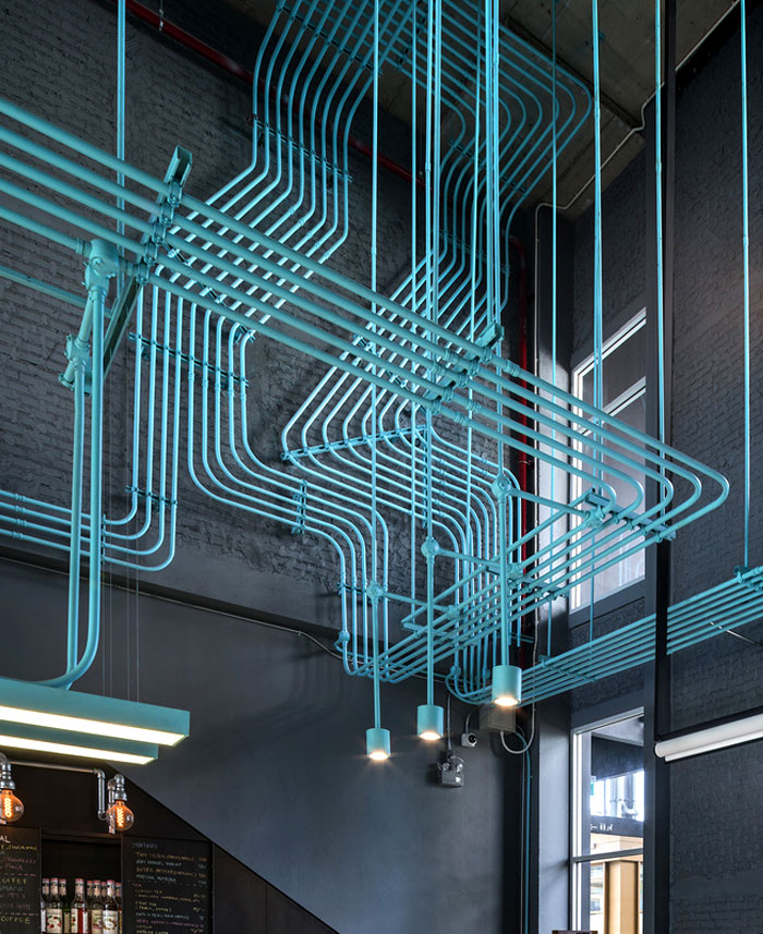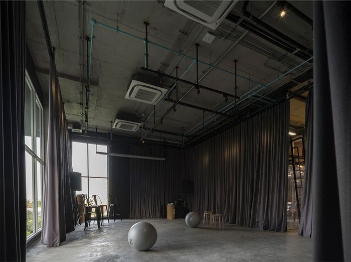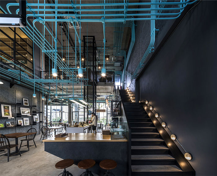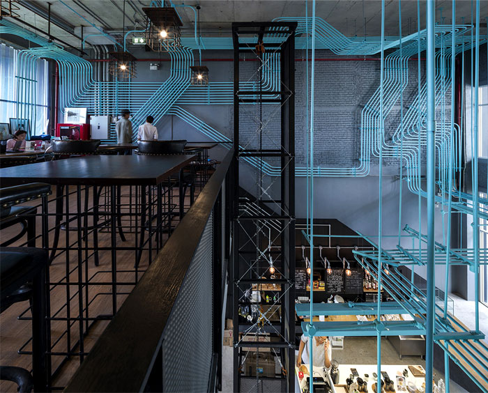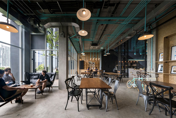 整個(gè) Co-Working Space 面積寬敞,以工業(yè)廠房的形式接待著來(lái)訪的客人,稍經(jīng)修飾的地面與裸露的混凝土立柱,帶來(lái)*為原始、粗獷的空間魅力,一層為咖啡廳,從售賣(mài)各種食品的吧臺(tái)到充滿工業(yè)感的桌椅,很難將它與工作空間聯(lián)想到一塊。