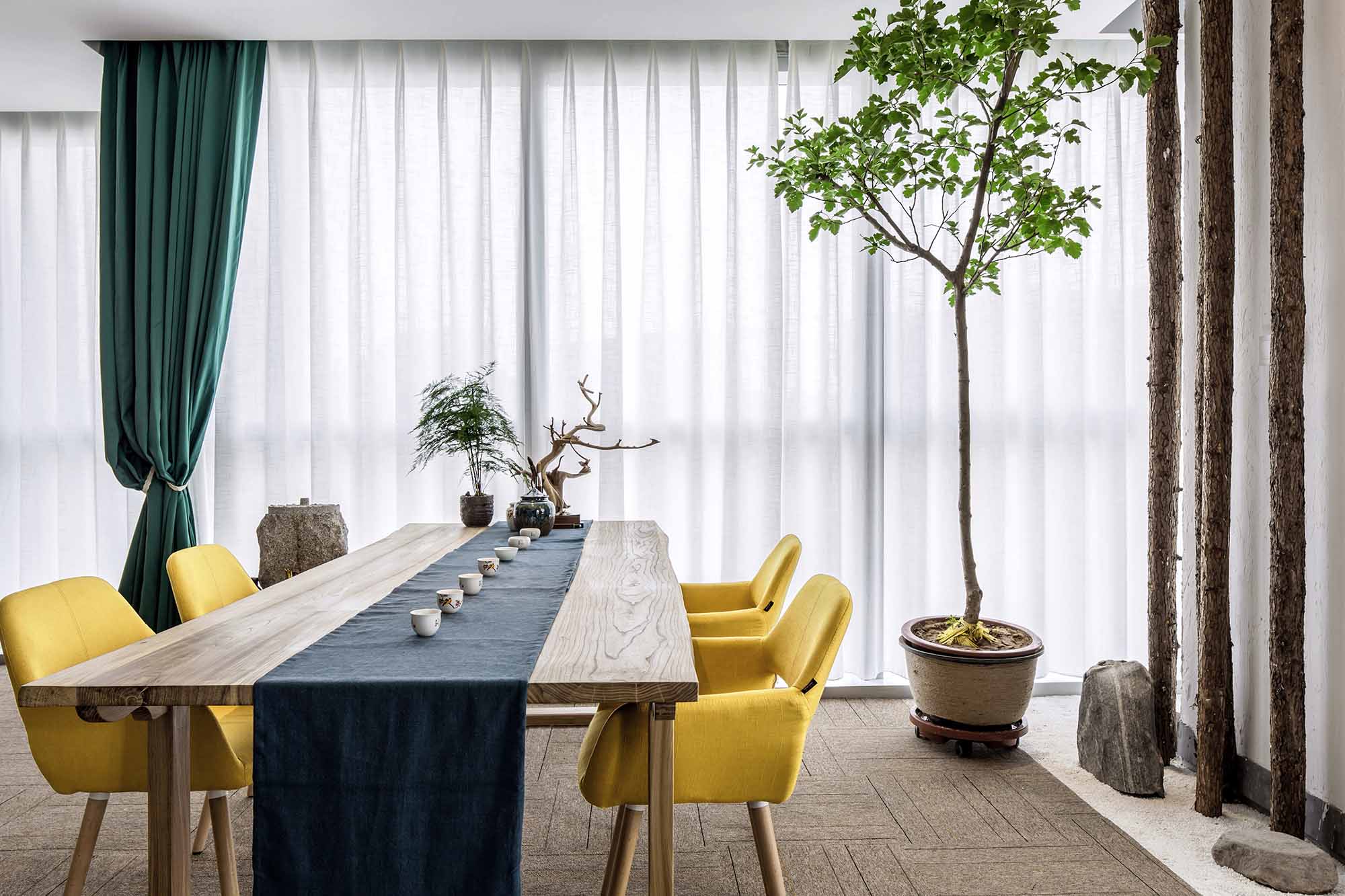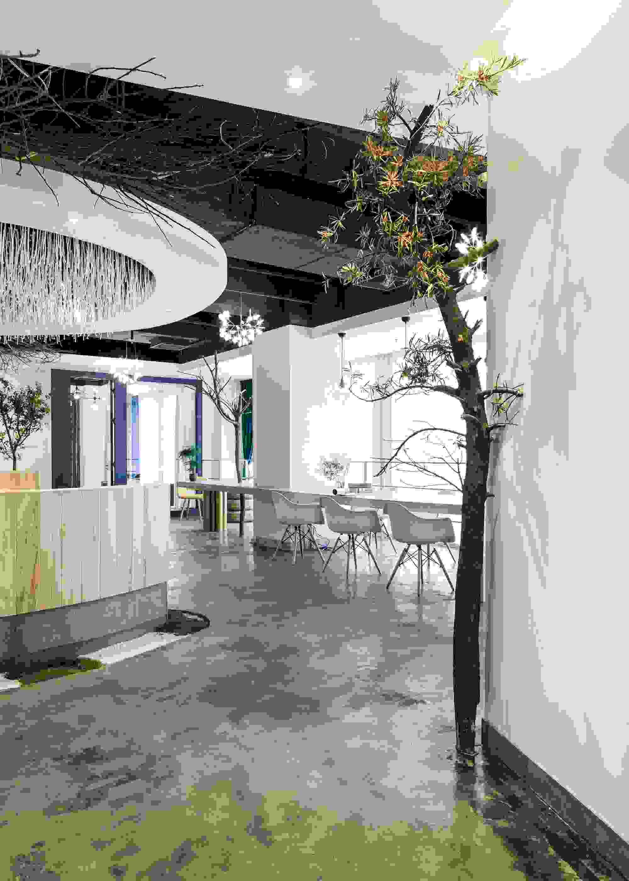 東方的美學(xué)向來(lái)是含蓄溫婉的,LOGO墻處的玻璃透景配合自然的竹石,隨著太陽(yáng)的變化,光影也在不斷的變化,猶如人生。在材料的運(yùn)用上選用的都是一些環(huán)保低碳的天然材料,如樹(shù)枝、石竹、枯木、天然原木板,地面則是采用了水泥自流平的方式。