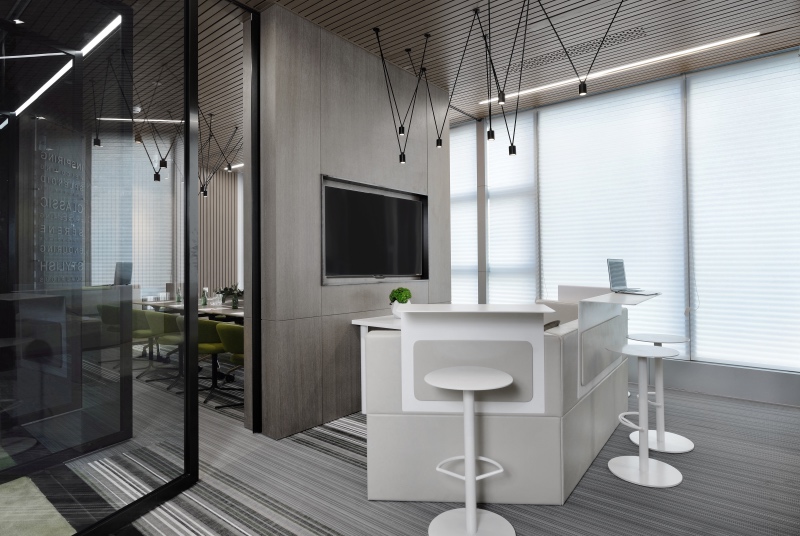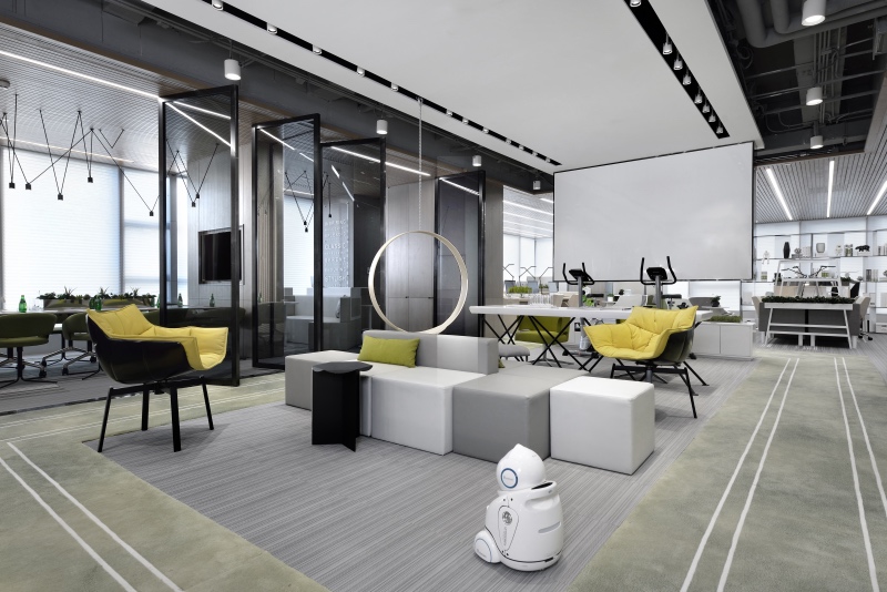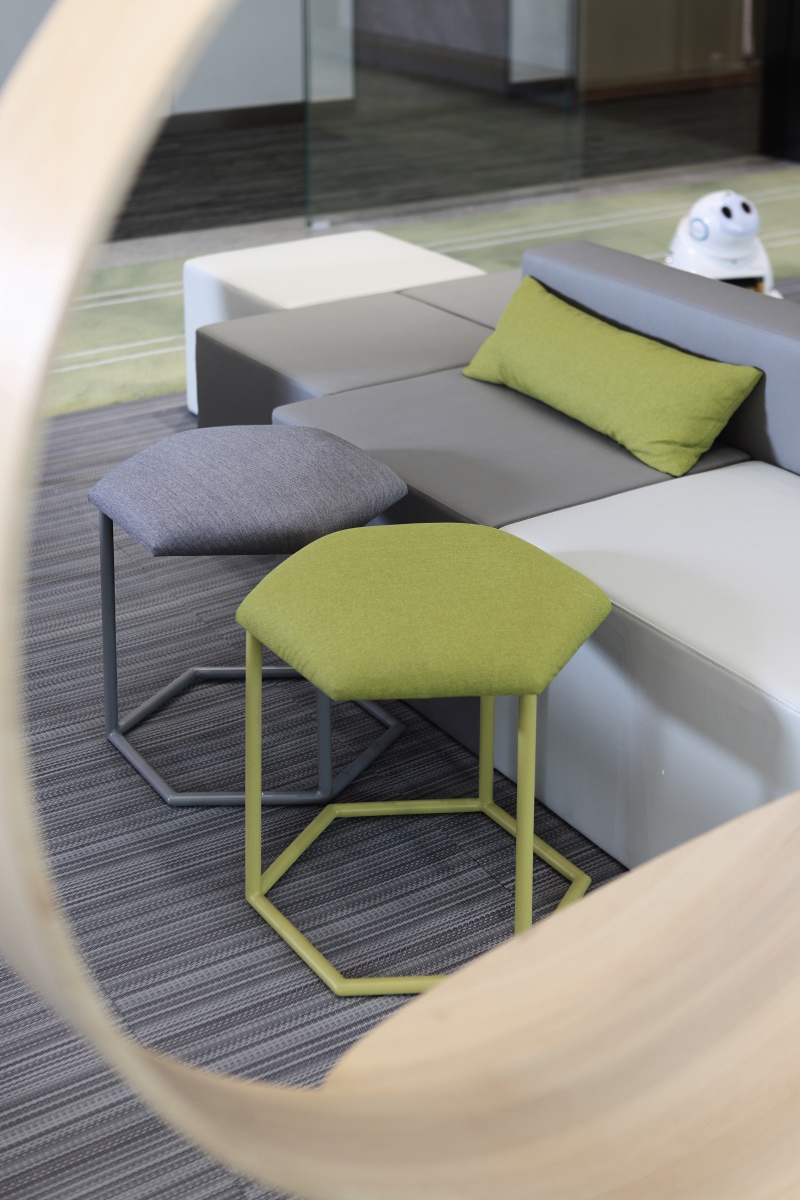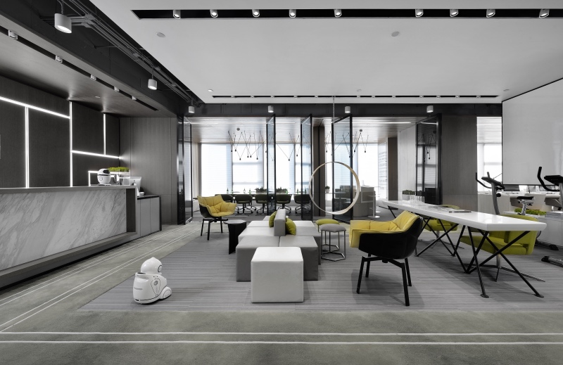 門廳區(qū)域摒棄傳統(tǒng)冷冰冰的接待形式,由超級吧臺、茶歇區(qū)、健康辦公區(qū)、討論區(qū)等功能組合而成,把互聯網開放性思維植入到日常辦公生活中。同時利用健康跑道地毯將整個空間串聯起來,讓空間更加具有活力和生氣。