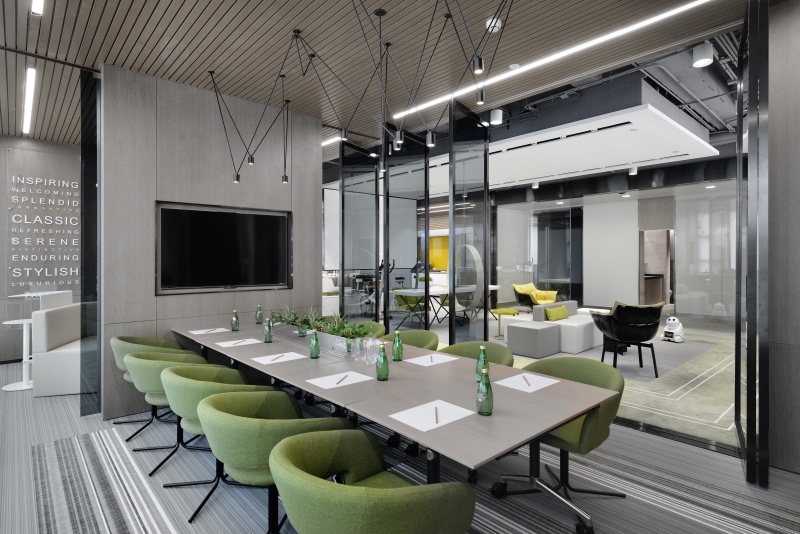 會議空間分為兩個空間,一個是集會議、培訓、活動于一體的多功能會議室,另一個集洽談、路演、討論于一體的創(chuàng)意互動區(qū),僅需開關移門,即可讓空間改變不同的功能屬性,迅速與其他場所互動。