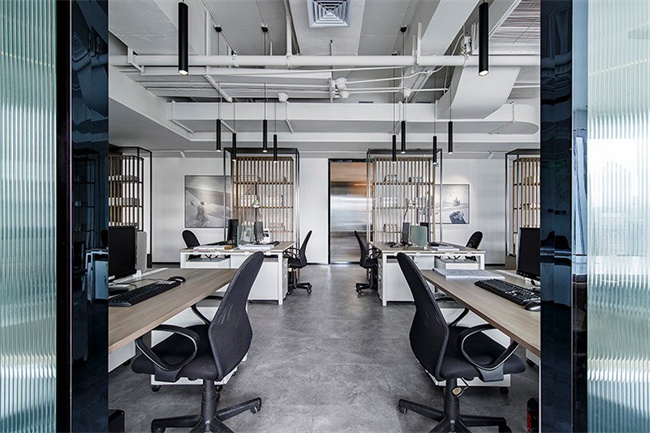 1、極簡風(fēng)格550平辦公室設(shè)計案例:空間的形式做到了極簡,沒有任何多余裝飾,橡木豎向格柵、乳膠漆墻、半透明玻璃移門、平頂天花、開放式天花、橡木飾面的柜子及門扇概括了所有的造型。通過這些簡單的形式,以營造出通透流暢的空間,空間可以通過格柵門及玻璃門開放或密閉,從而滿足不同的使用需求。豎向格柵使得空間具有了多層次的穿透與流動,讓路徑串聯(lián)的每一個獨立空間可以借由半透明玻璃門產(chǎn)生視線上的交叉,而視覺的穿透還保證了空間的連續(xù)性。走廊和辦公區(qū)用格柵書架作為隔斷,整齊疊放的書籍與辦公桌上的植物使辦公環(huán)境更加輕松舒適。