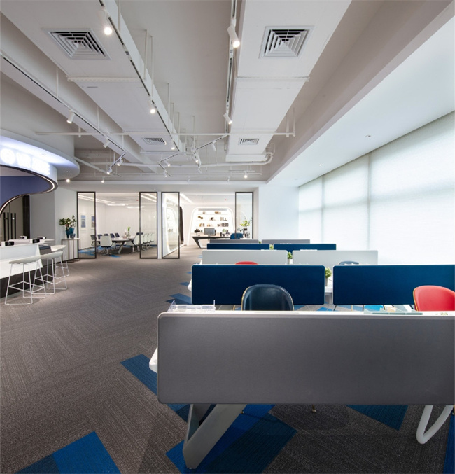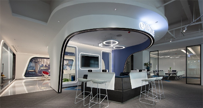 4、本案例的公司從事的是高科技行業(yè),甲方要求室內(nèi)的空間設(shè)計要具有未來的科技感。因此在500平辦公室裝修設(shè)計中,運用了曲面弧形的流線型設(shè)計,給人營造了一種置身與太空艙的感覺。