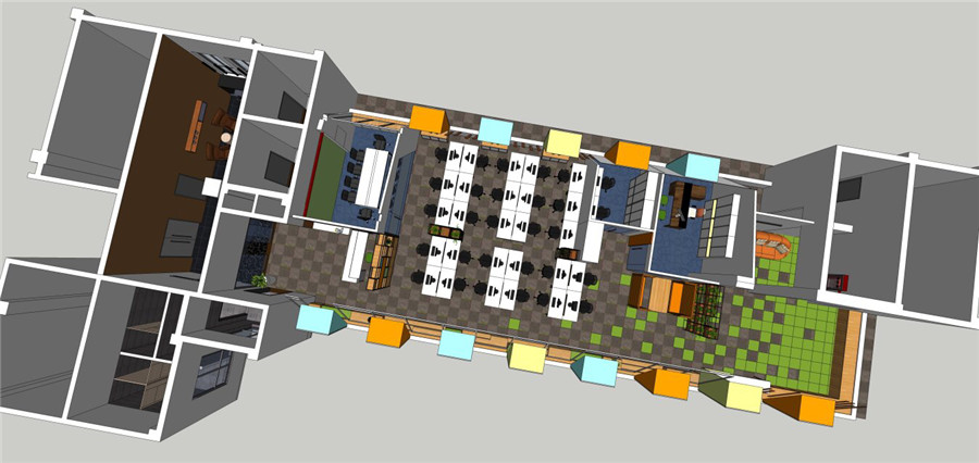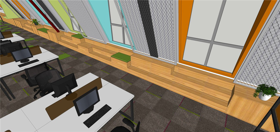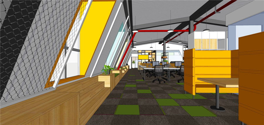 該項目*吸引我們的是斜坡式建筑頂,設(shè)計師決定保留原建筑裸露天花是本案設(shè)計的開始。設(shè)計任務(wù)是建造一個涵蓋多部門、多功能,年輕時尚的辦公環(huán)境。