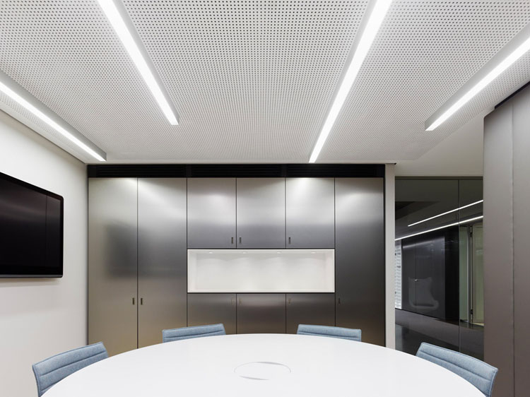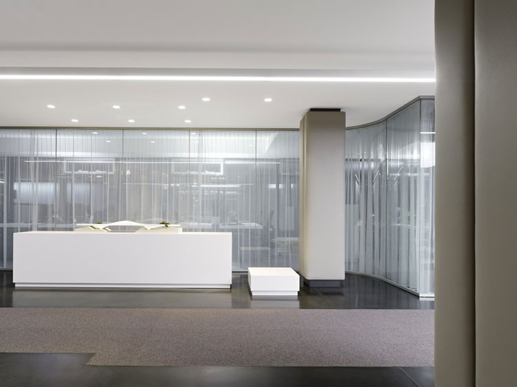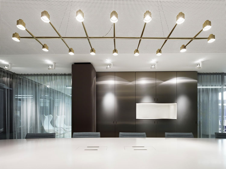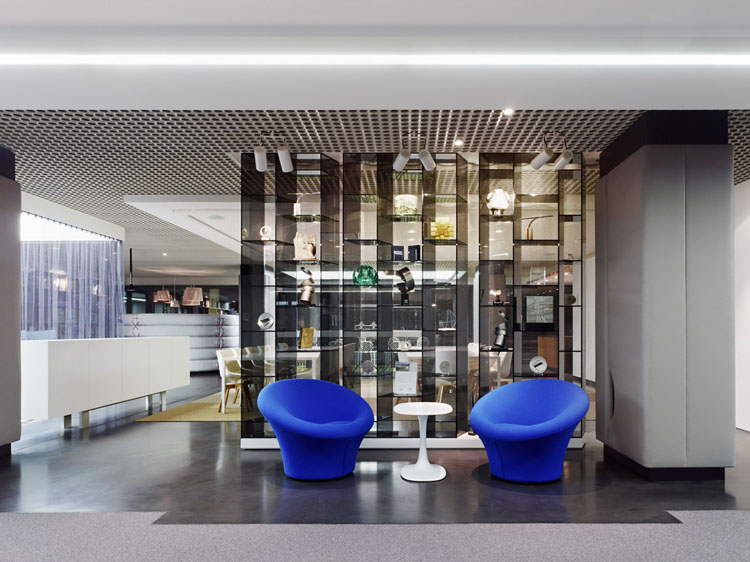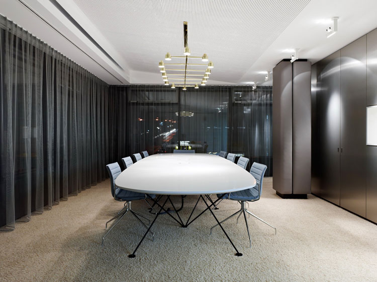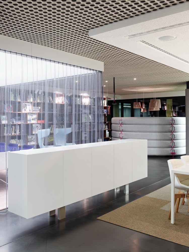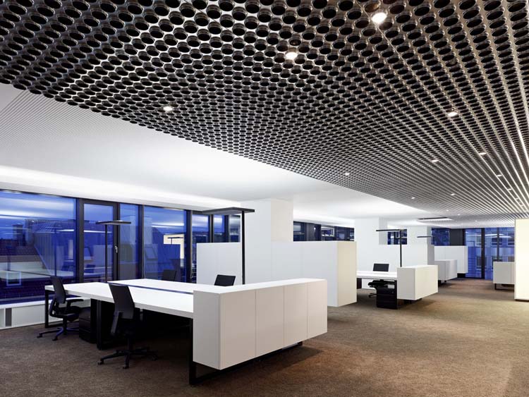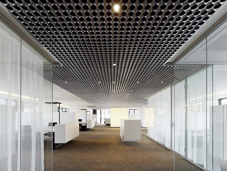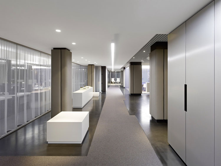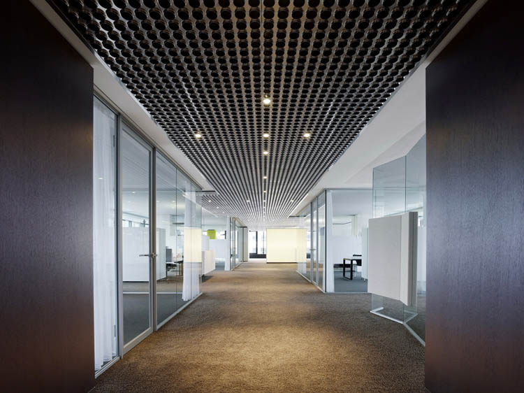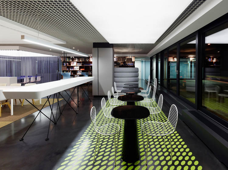 其概念是設(shè)置一個為所有部門共用的交流空間,以及滿足不同協(xié)作需要的不同分區(qū)。原先單獨、分散化的辦公室變成大型開放式的辦公空間,鼓勵同事之間的交流。每一個樓層都有單獨的辦公室和單獨的工作組空間,以及大型開放式工作間。各個工作站的工作人員能夠相互交流。玻璃立面的辦公室中,十字形的結(jié)構(gòu)將開放式的空間分隔為各個單元,但又是集中的工作環(huán)境。一系列暖色調(diào)的材料營造出不同的氣氛,有時候讓員工感覺到像在家里一樣。辦公樓中的地毯有著清晰的路徑指示和功能分區(qū)。就餐區(qū)地板上的綠點如同變魔術(shù)一樣變出草地的效果,構(gòu)筑起通向露臺的一道概念式的橋梁。向露臺打開的半圓形裝飾空間與其他部分區(qū)分開來,透明的蕾絲幕布構(gòu)成了半私密的空間,而清新的色彩、深藍(lán)色的桌子和粉色的地毯,無不為員工帶來激發(fā)工作情緒的氛圍。